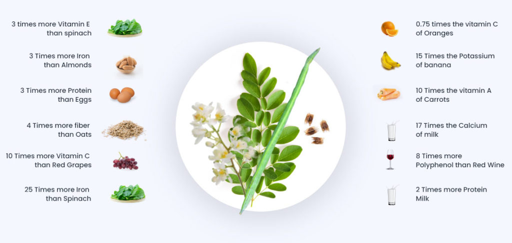 Commonly known as Drumstick tree, Moringa tree is native to South Asia and has been a part Indian diet and Ayurveda medicines since ancient times. From seeds, roots to leaves & flower, every part of the Moringa tree is power-packed with nutrients. There are about 90+ nutrients, 46+ antioxidants & 23 anti-inflammatory compounds present in Moringa. It has recently gained popularity in the western countries as a natural superfood, especially for its immune-boosting properties. It’s also getting established as the most nutritious plant in the world.